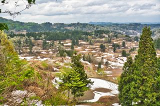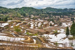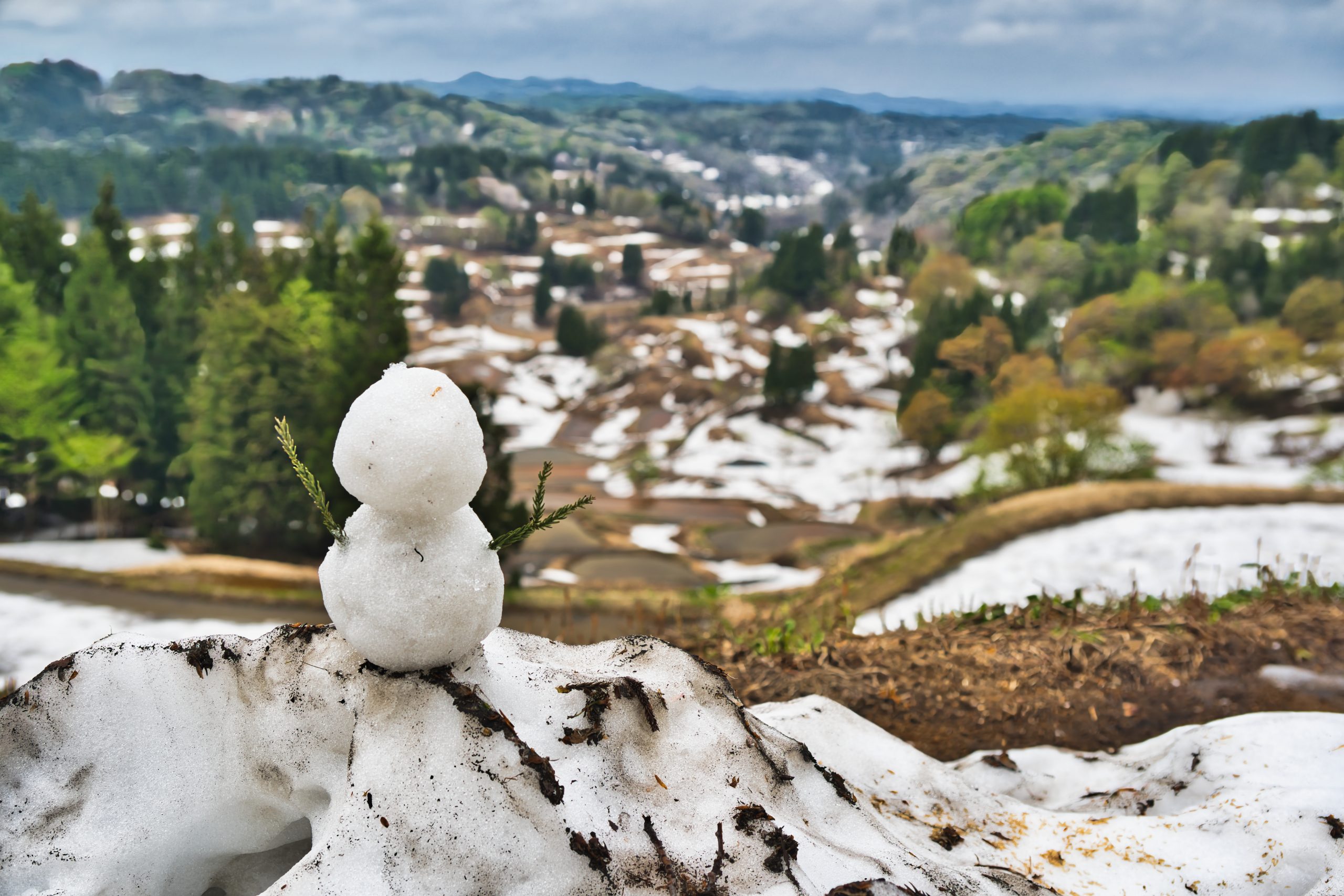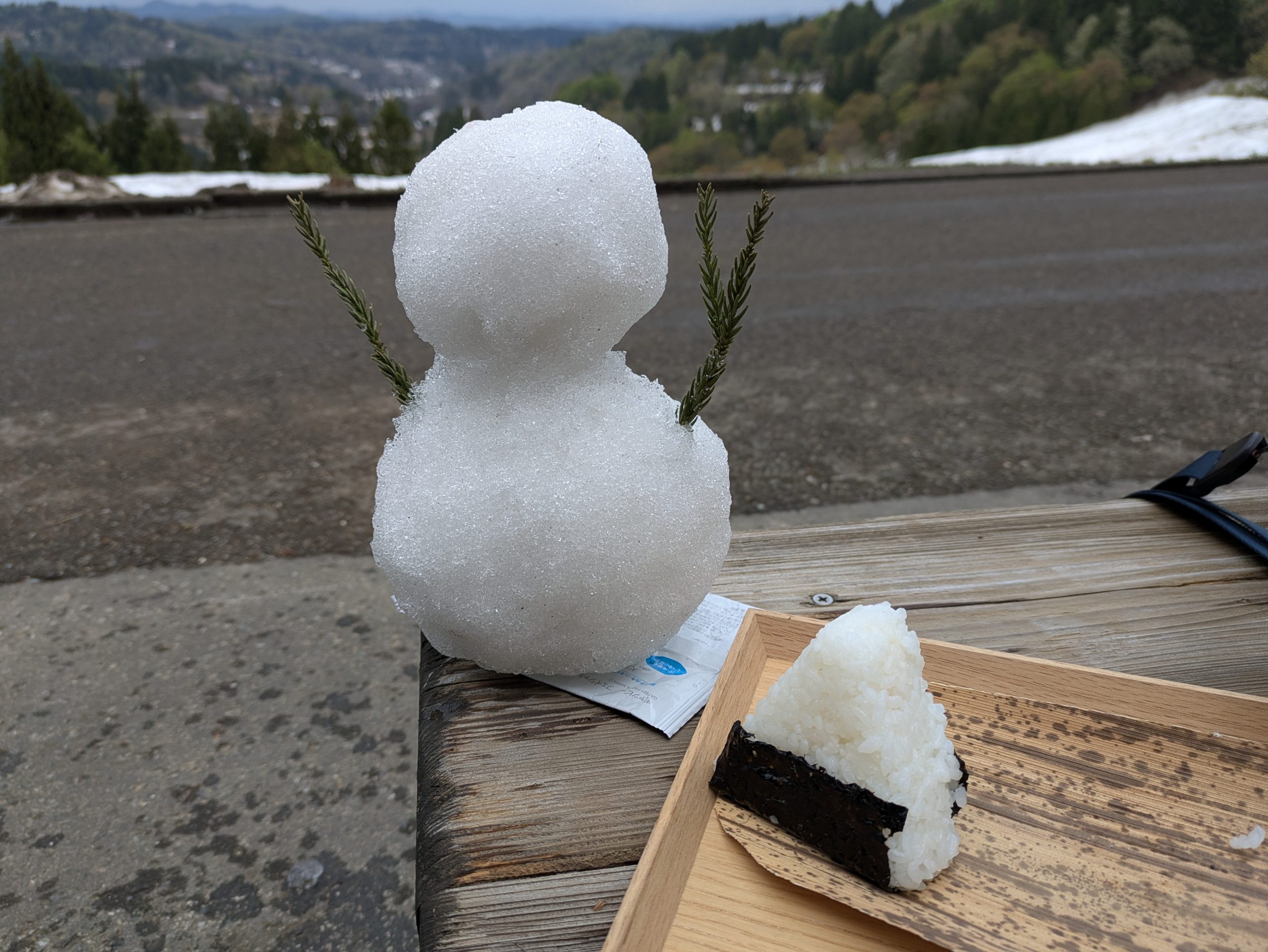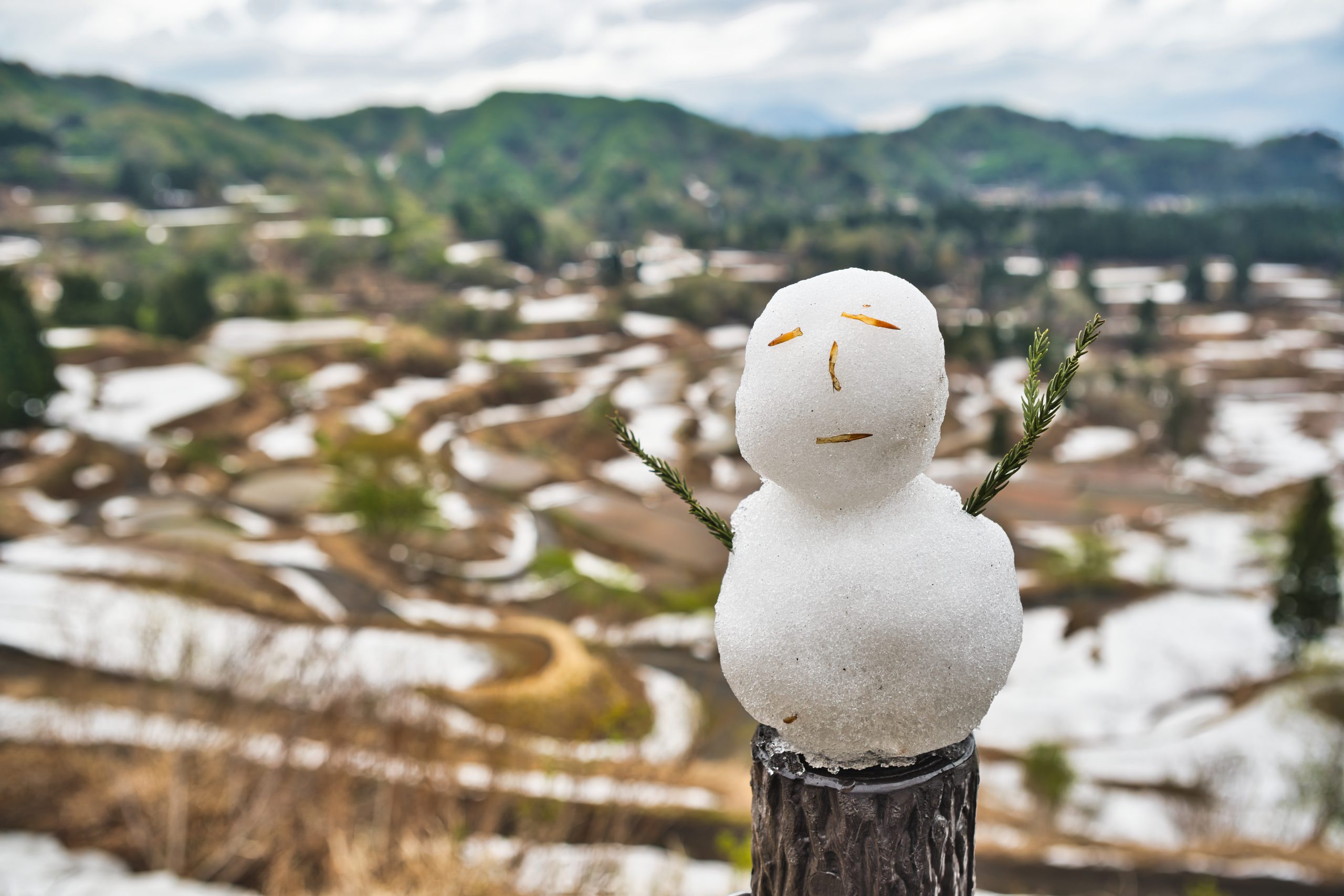 まずは、 美人林へいって まだまだ 雪が 残ってる感じ 星峠の棚田にも よってみる 雪だるまを作って 一緒に御飯 顔もつけてみる ここも雪が残ってる 昼は、へぎ蕎麦を食べる 日本海をみつつ 人魚像を 日本海を見守ってる? 宿ので 夕ご飯を 食べる